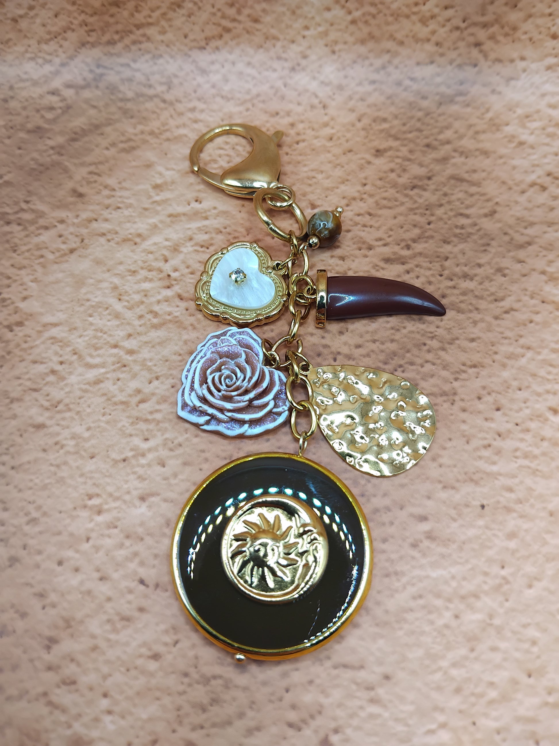 Un grigri mystérieux et raffiné, composé d’un médaillon prune et doré soleil/lune, d’un cœur nacré serti, d’un crochet corne prune foncée, d’un coeur texturé effet fleur, et d’un médaillon doré martelé. Chaque détail évoque l’intuition, la magie et l’élégance. À porter comme un talisman moderne.