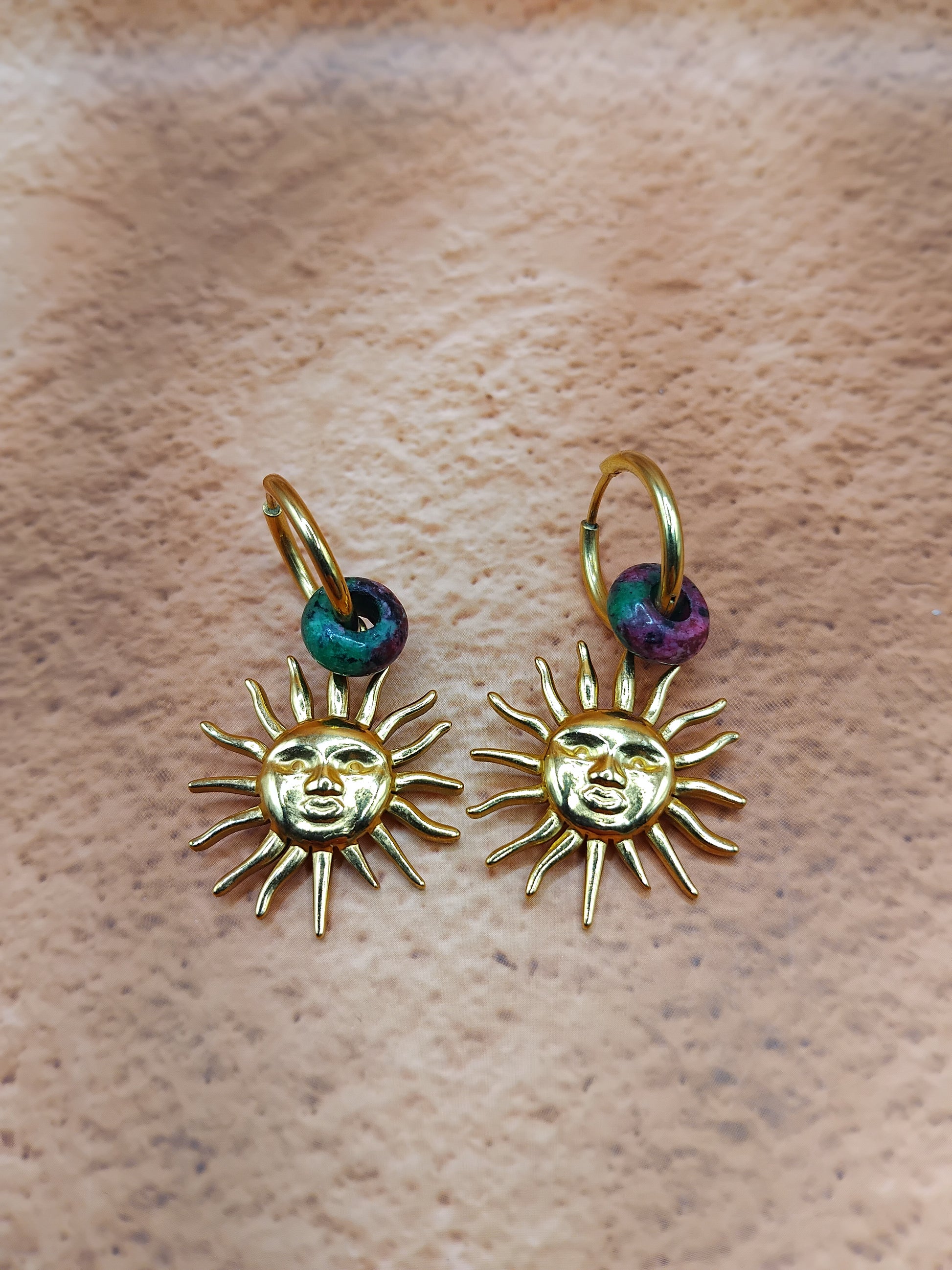 Créoles en acier inoxydable avec perles d’épidote et pendentif soleil. Un bijou éclatant aux nuances colorées et naturelles.