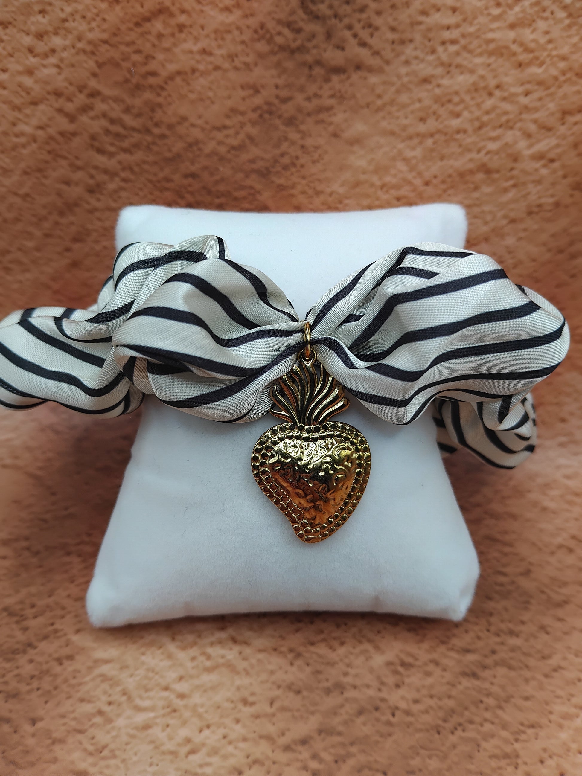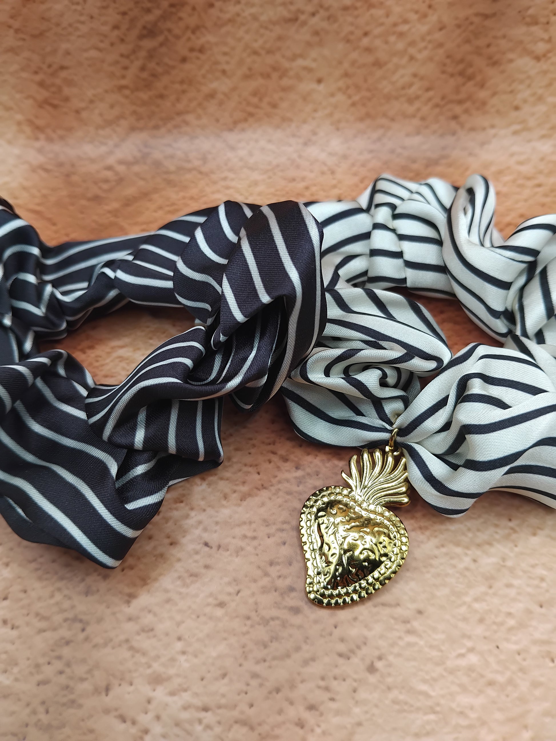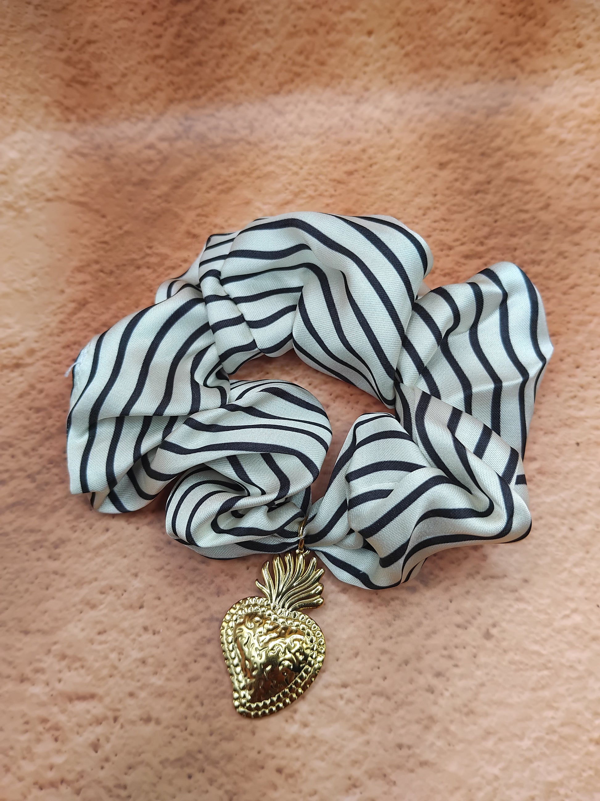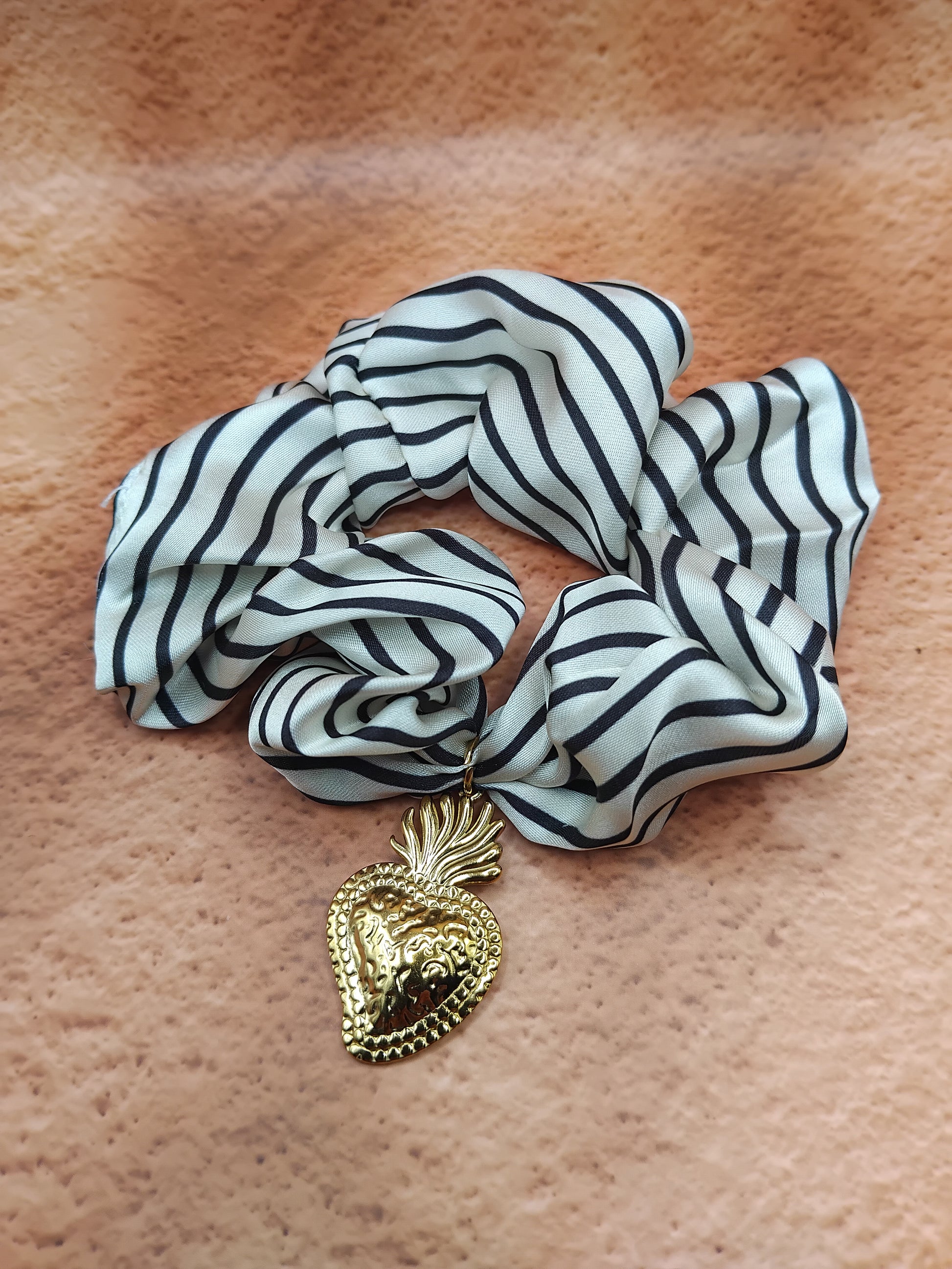 Un chouchou crunchy satiné au style affirmé, orné d'un charm cœur sacré doré en acier inoxydable, au relief texturé et aux détails flamboyants. Disponible en rayures noires & blanches pour un look graphique, ou en rayures dorées & rose poudré pour une touche plus douce et féminine.