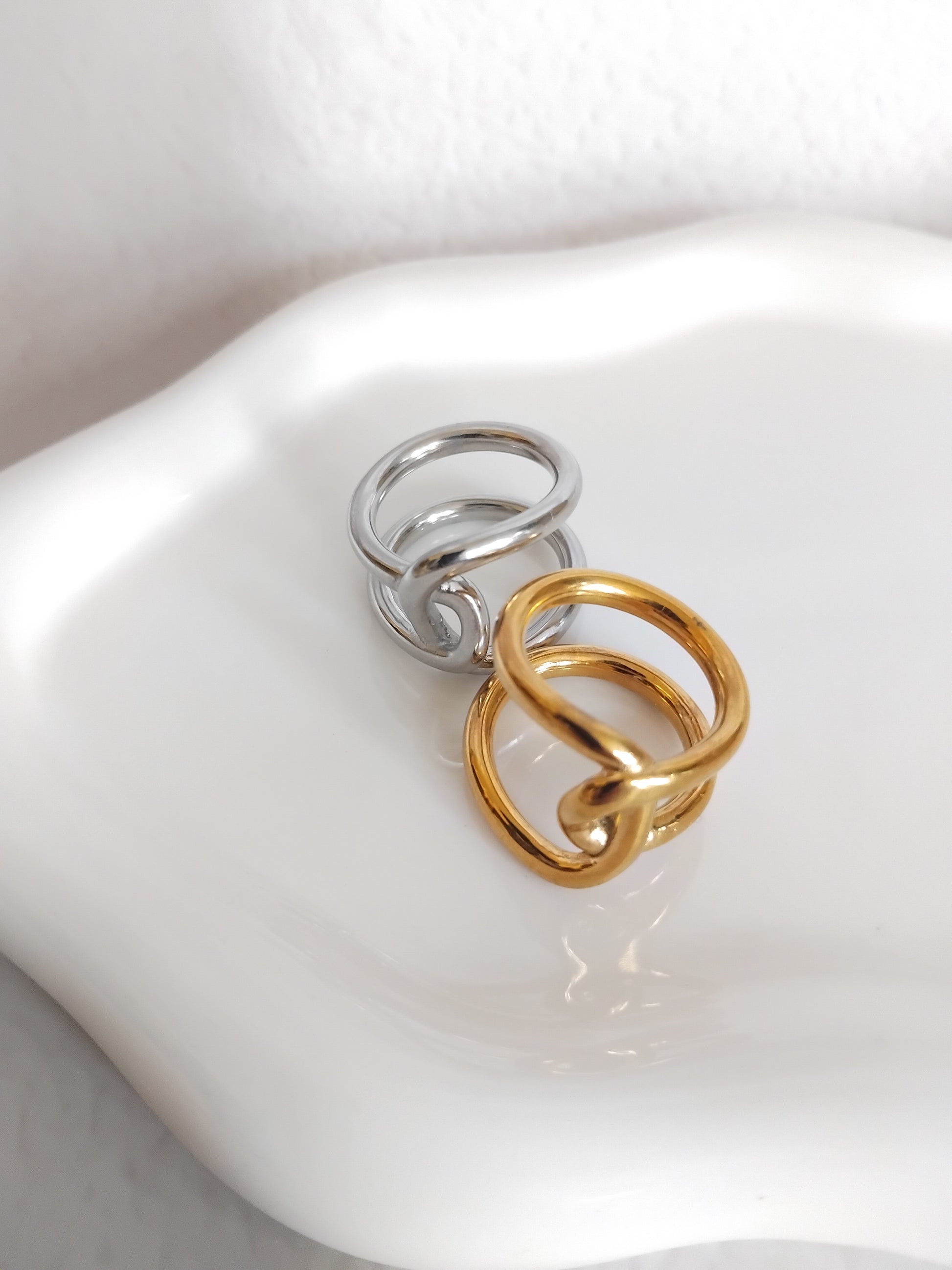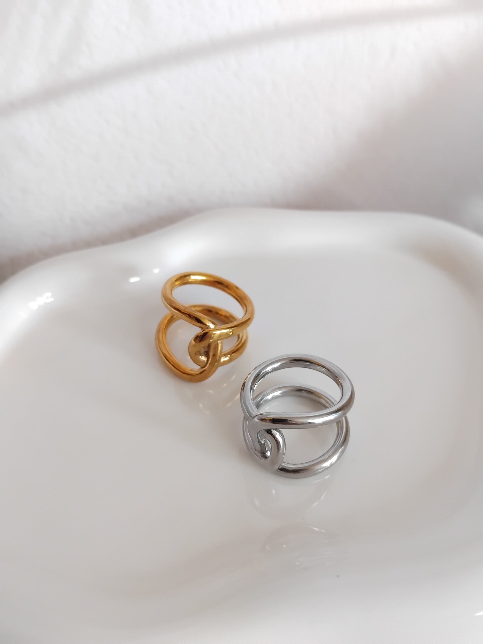 Deux bagues en acier inoxydable, l’une dorée, l’autre argentée, avec un design entrelacé.