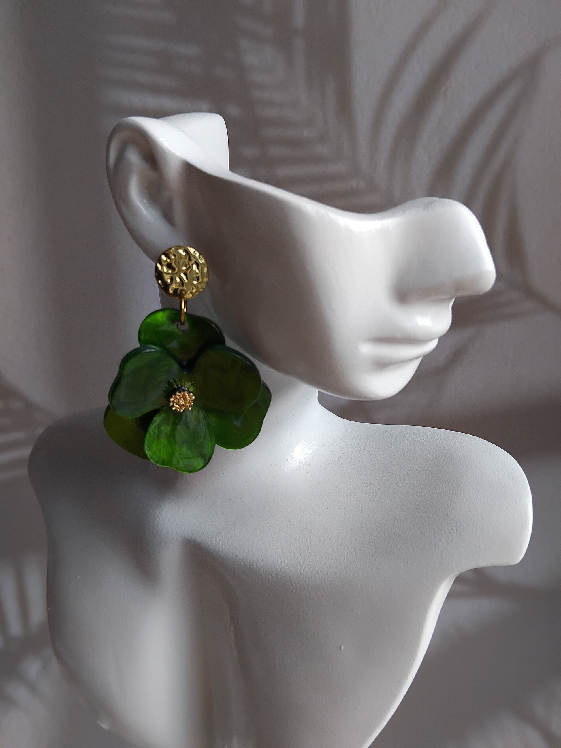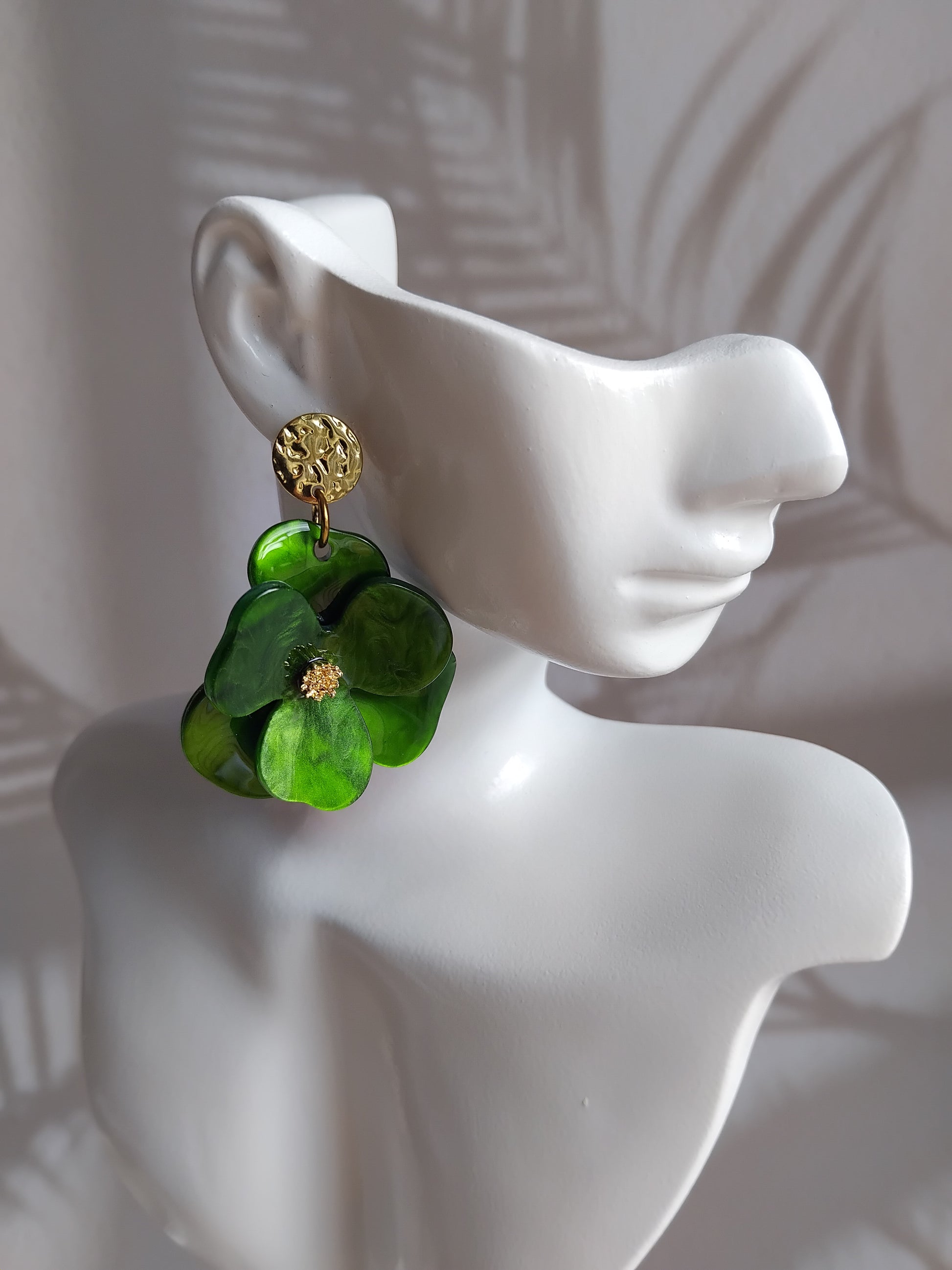 Des boucles d’oreilles en résine sculptée en forme de fleur, montées sur des attaches en acier inoxydable doré pour une finition élégante et durable.