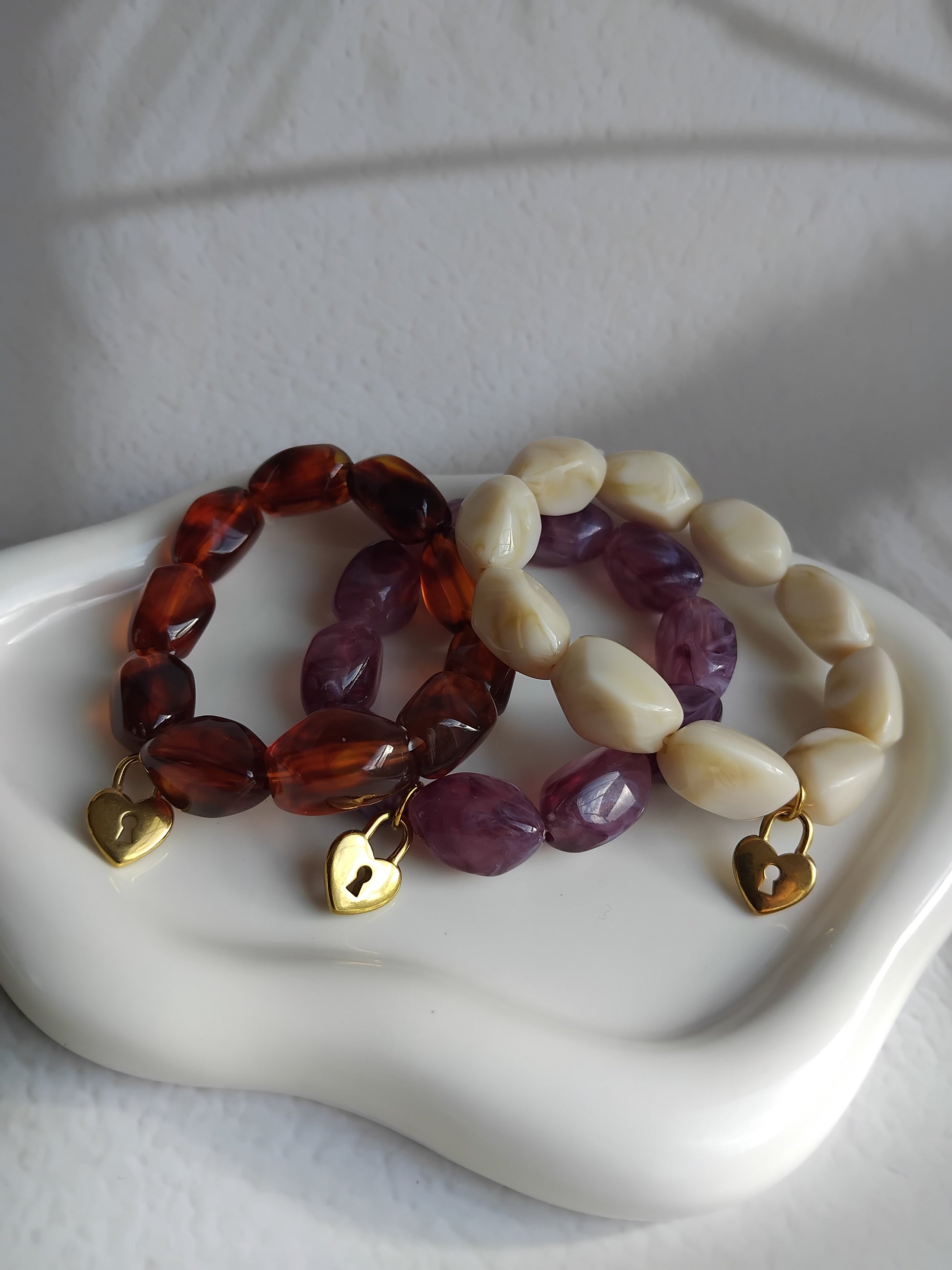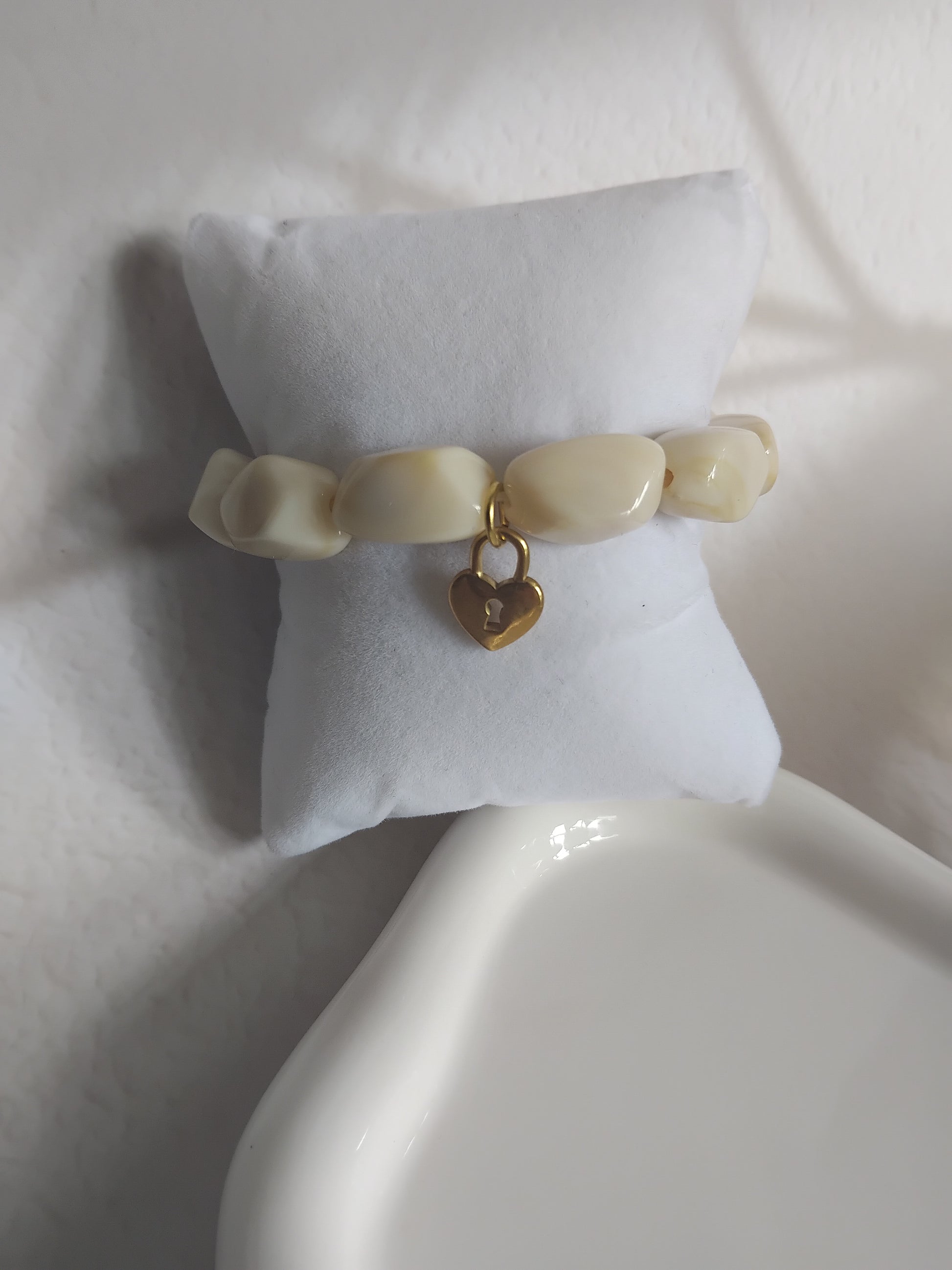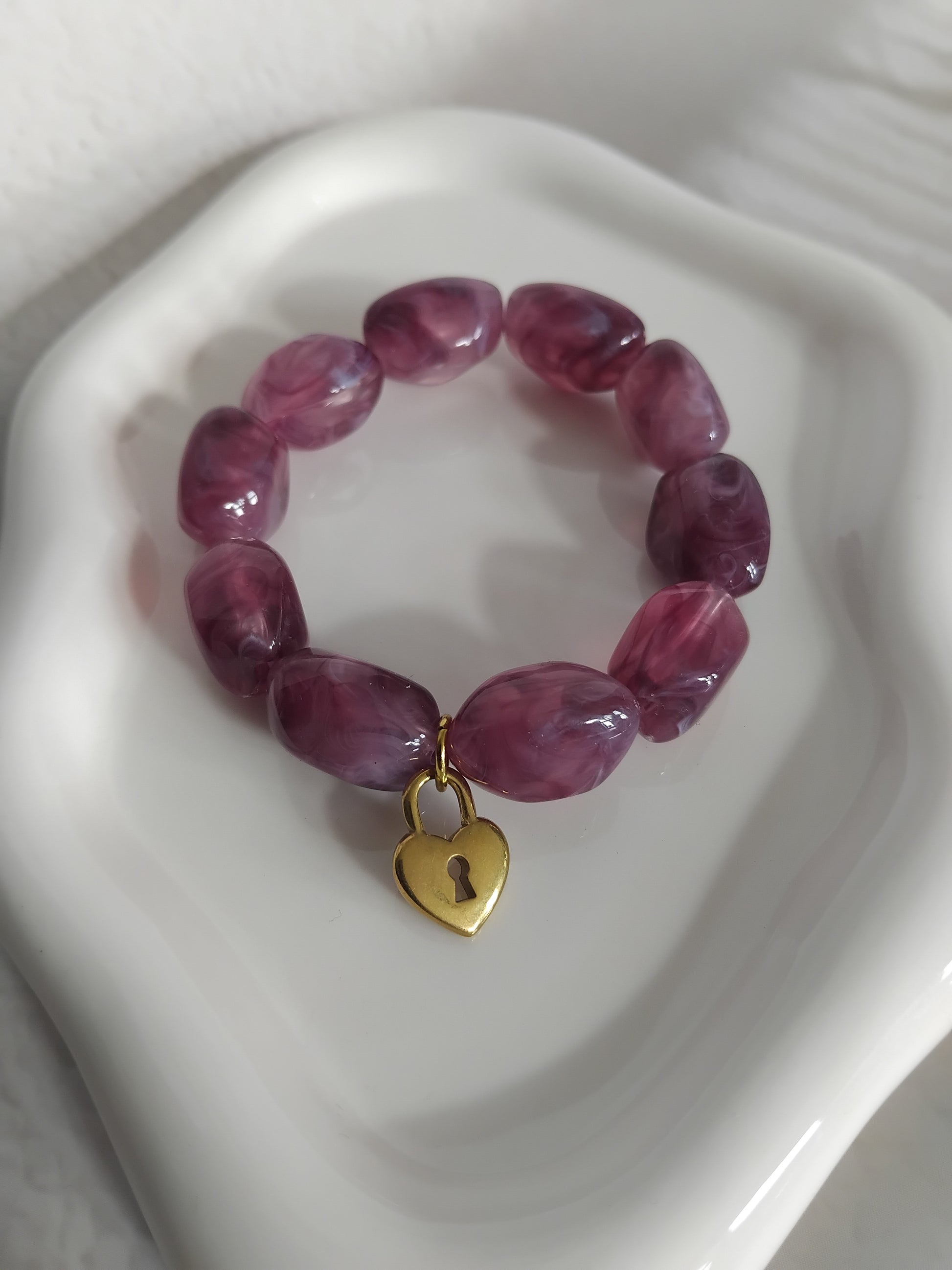 Un bracelet élastique composé de grosses perles en résine avec son pendentif en acier inoxydable doré, en forme de cadenas cœur,.