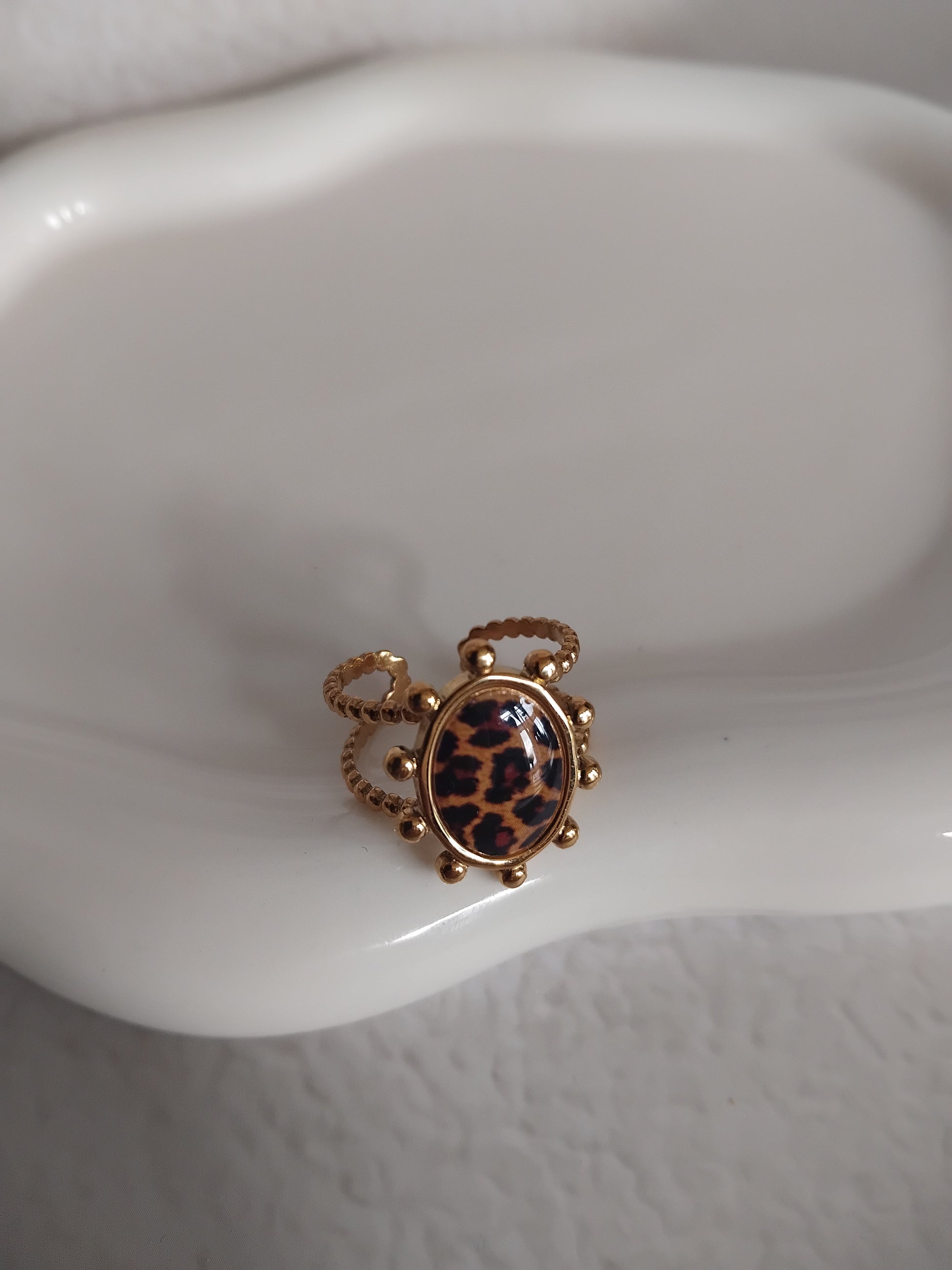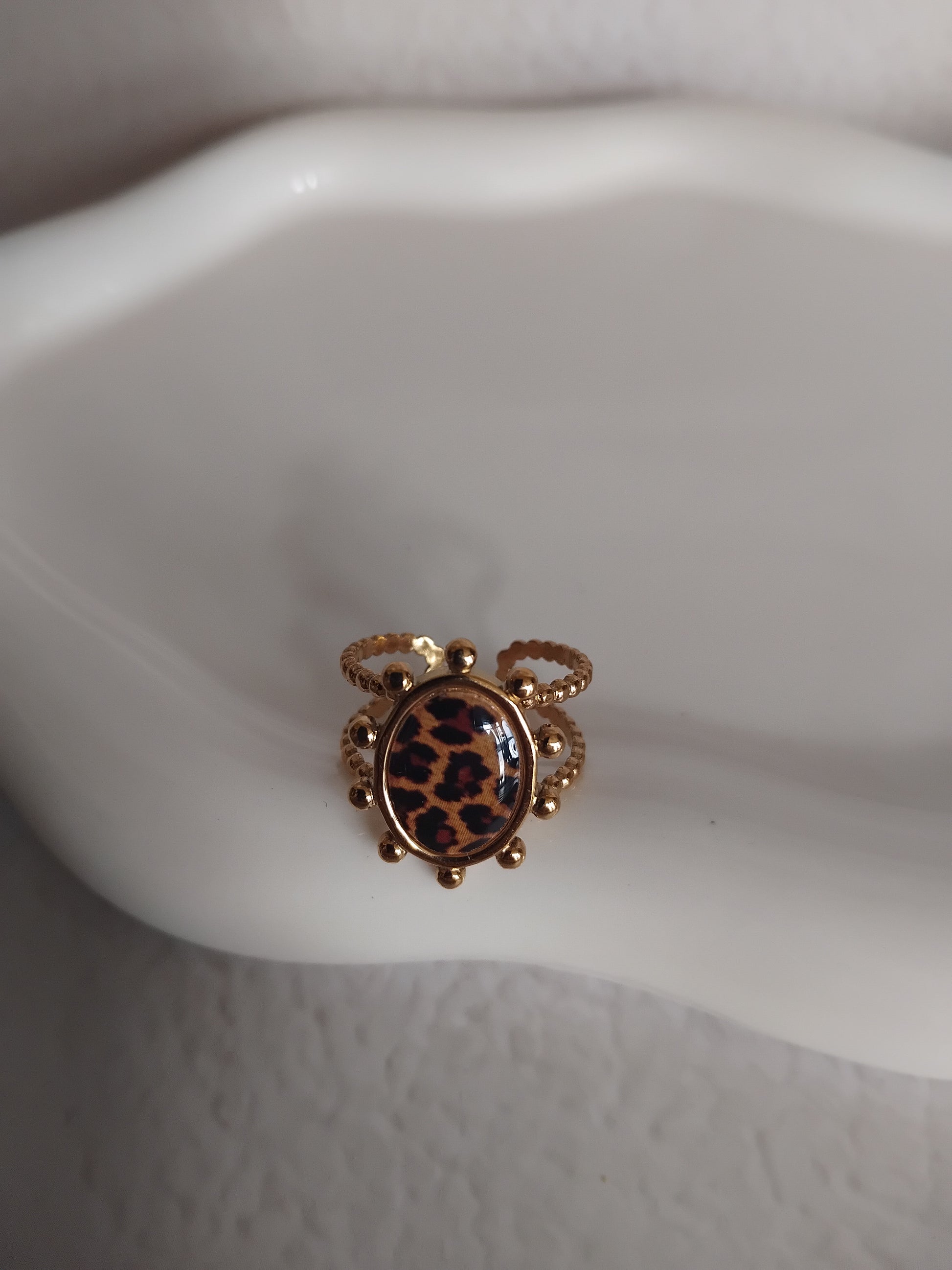 Bague dorée avec cabochon ovale imprimé léopard, encadré de petites perles dorées en relief.