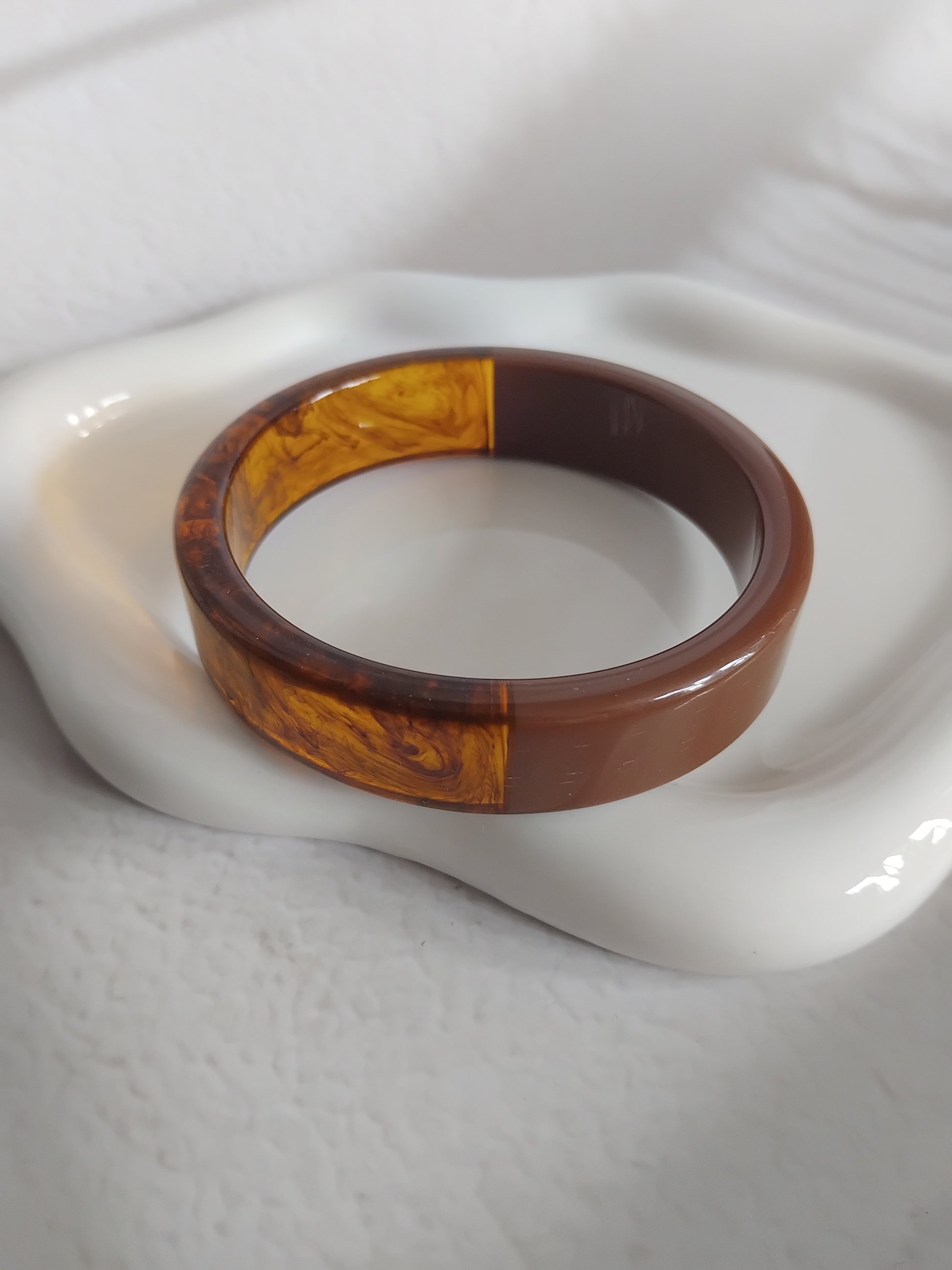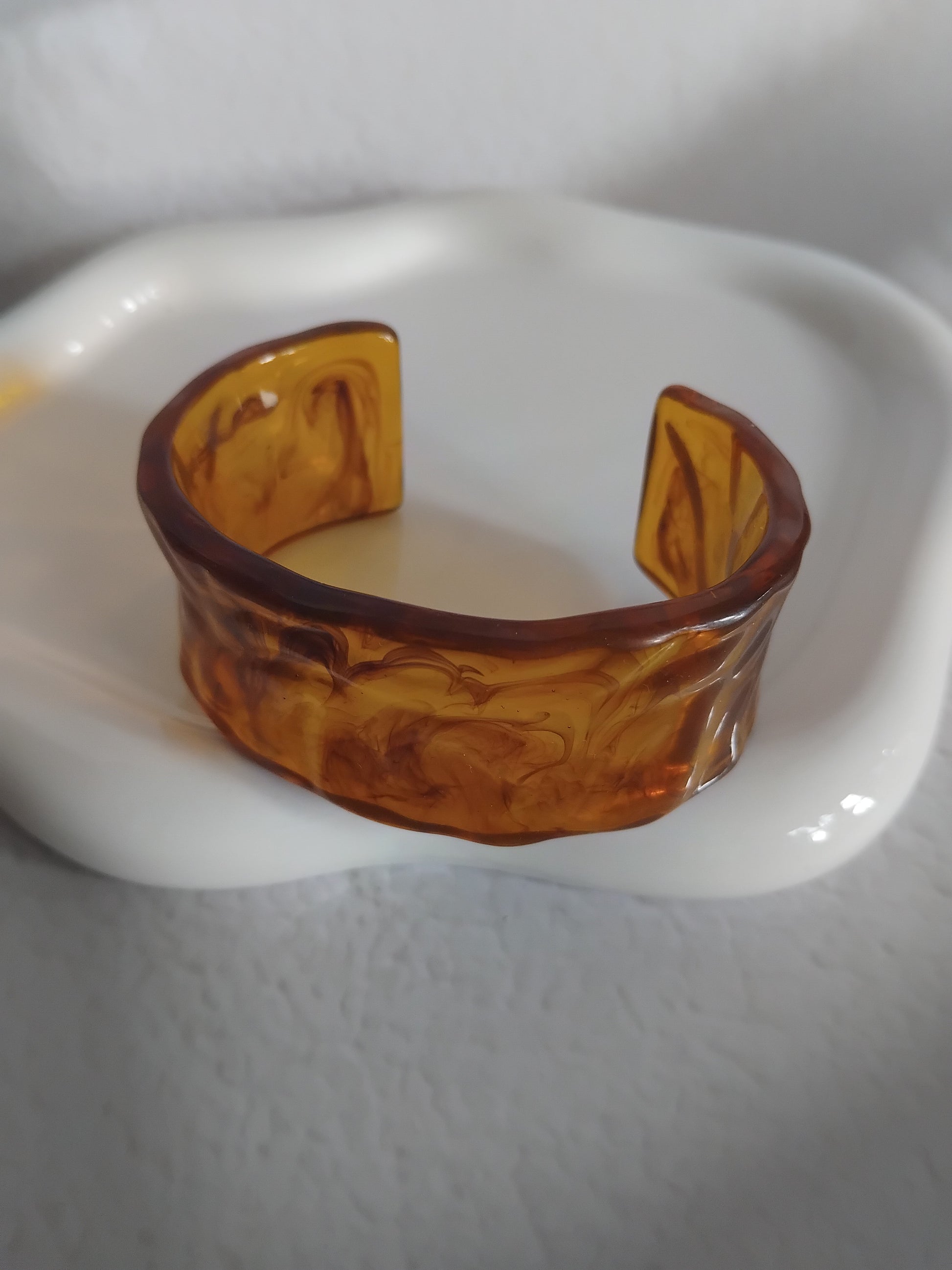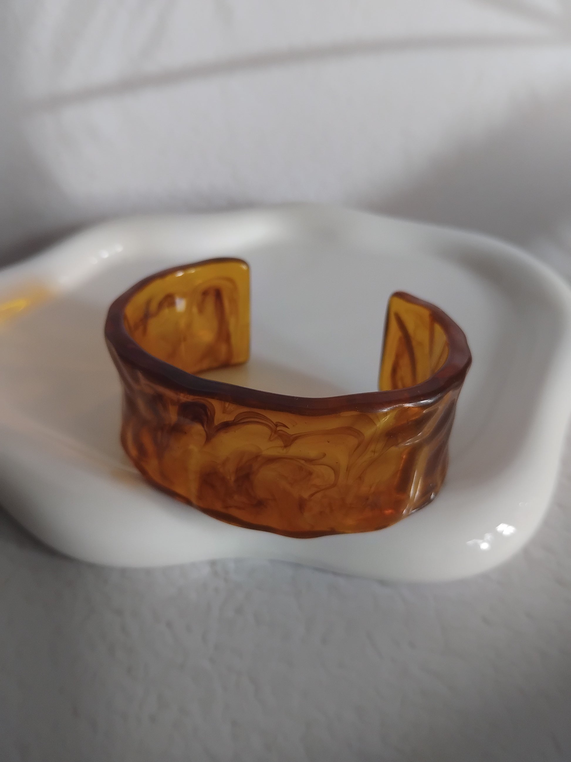 Une collection de bracelets rigides en résine acrylique aux formes généreuses, aux motifs marbrés, finishes glossy ou détails dorés, pensée pour celles qui aiment les accessoires qui claquent.