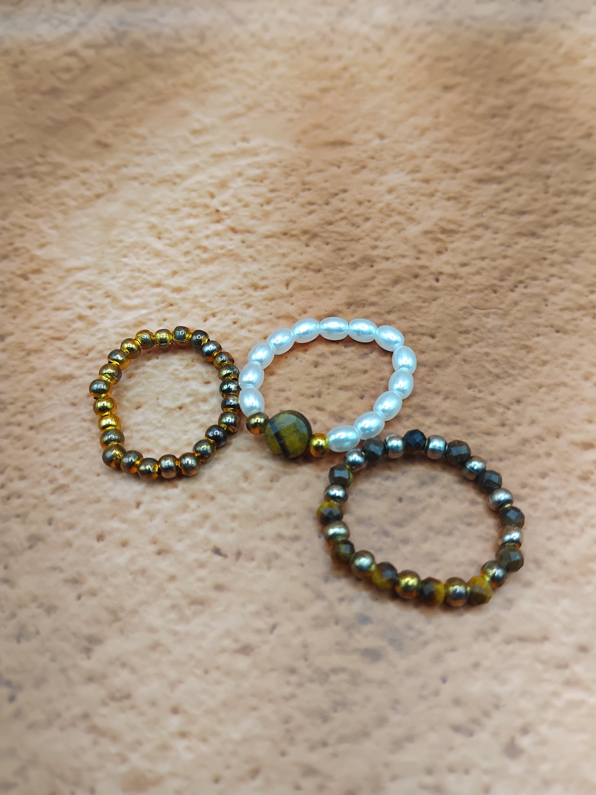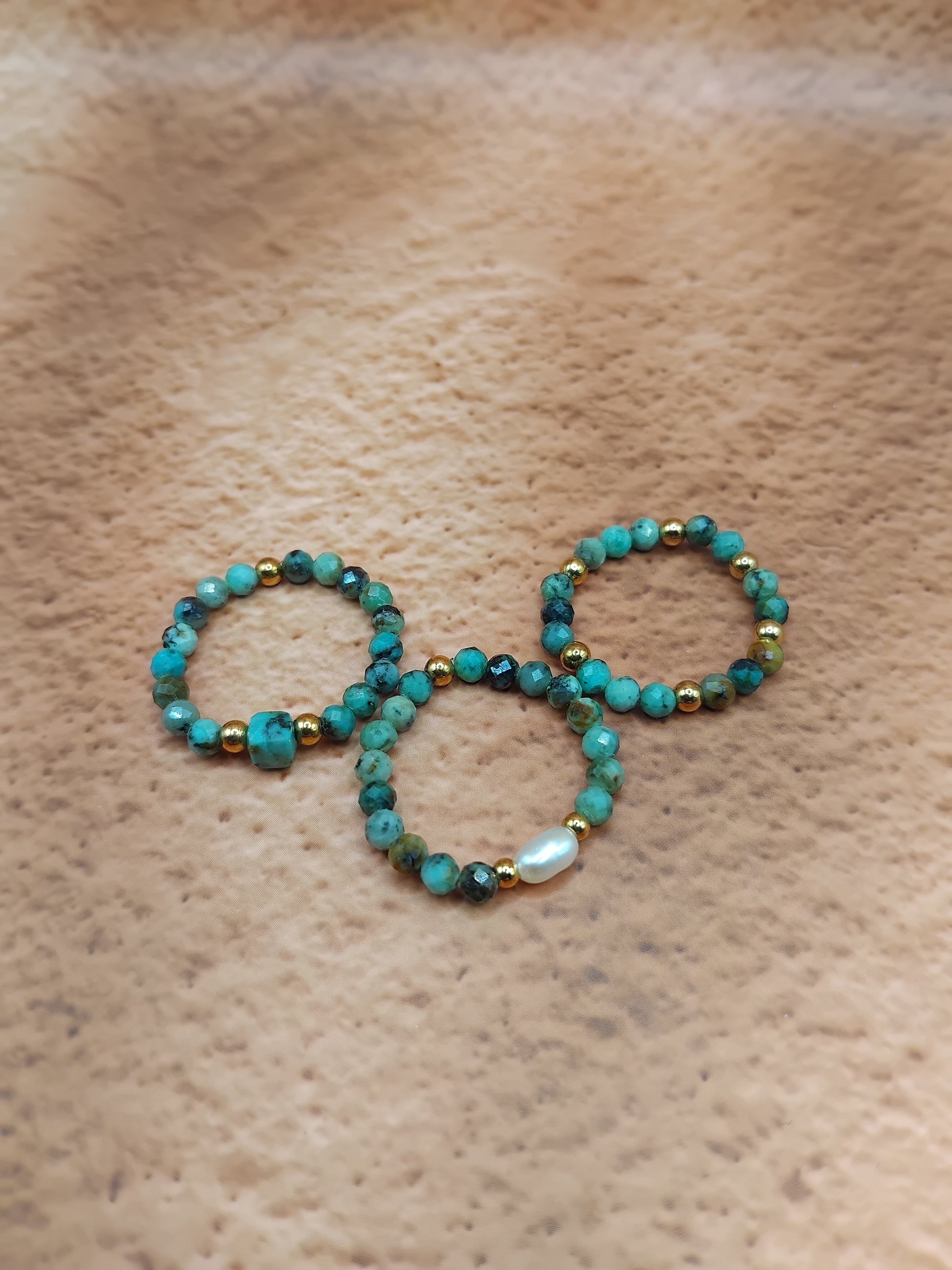 Trois bagues élastiques composées de perles semi-précieuses et de détails dorés, montées sur fil stretch pour un confort parfait.