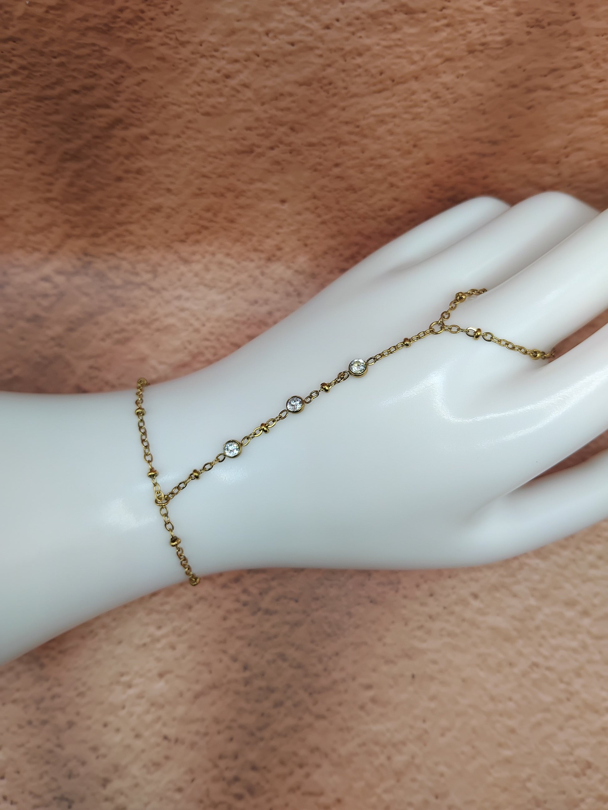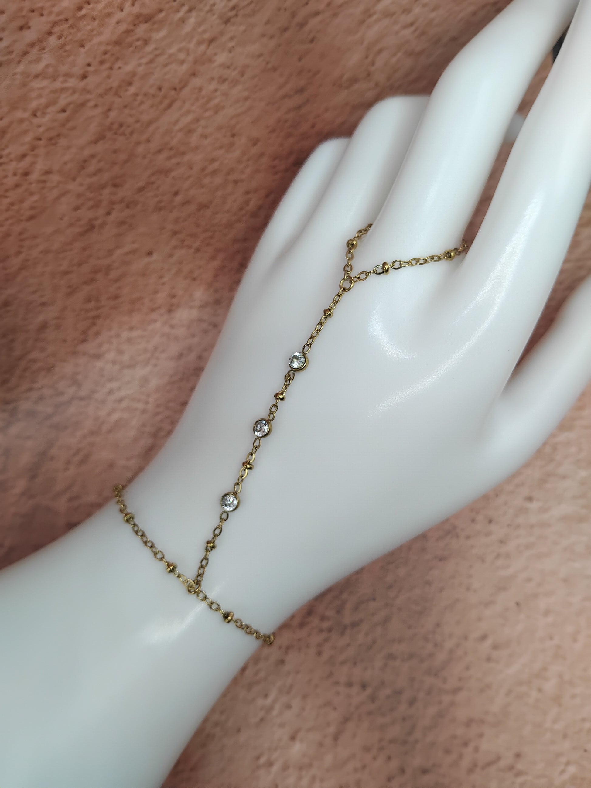 Bracelet-bague en chaîne fine dorée, avec zircons scintillants et détails perlés.